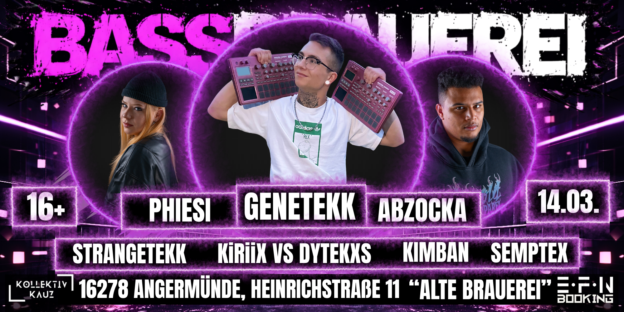 Mit GENETEKK, PHIESI & ABZOCKA machen wir am 14.03. nochmal richtig Abriss! Zusammen mit Techno und Tekk Sets vom Kollektiv Kauz wirds wieder spaßig.